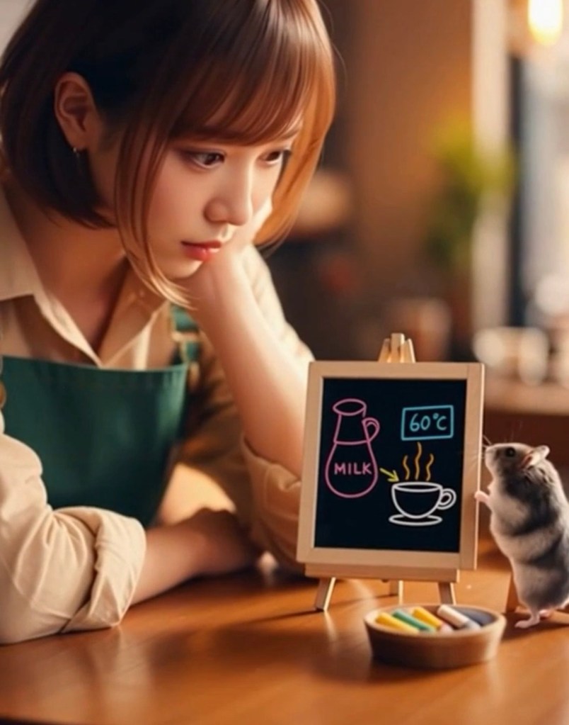 新作パフェに合わせるラテのミルクの温度について、うちのちび先生(🐹)がどうしても譲らなくて。私は少し熱めがいいと思ったんですが、先生が黒板まで持ち出して『風味を損なわない絶対温度』を熱弁し始めて……結局3時間ですよ!?